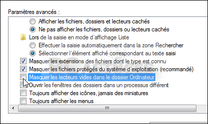 - Décochez alors la case Masquer les lecteurs vides dans le dossier Ordinateur.