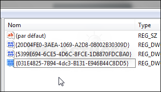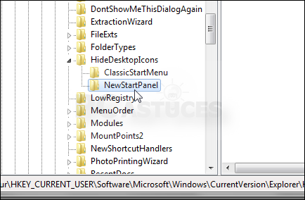 - Déroulez la clé HKEY_CURRENT_USER, Software, Microsoft, Windows, CurrentVersion, Explorer, HideDesktopIcons, NewStartPanel.