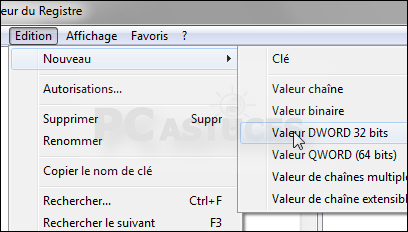 - Cliquez sur le bouton Edition, sur Nouveau puis sur Valeur DWORD 32 bits.
