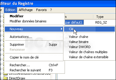 - Cliquez sur le menu Edition, Nouveau puis sur Clé.