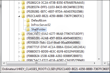 - Dans la fenêtre de l'éditeur du Registre qui s'ouvre, déroulez la clé HKEY_CLASSES_ROOT, CLSID, {F02C1A0D-BE21-4350-88B0-7367FC96EF3C}, ShellFolder.