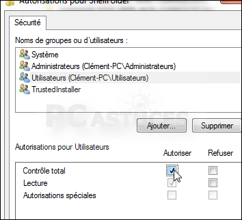 - Sélectionnez le compte Utilisateurs et cochez ensuite la case Contrôle total de la colonne Autoriser. Validez par OK.