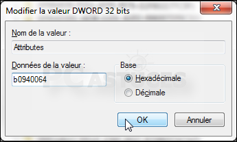 - Remplacez alors la valeur b0040064 par b0940064. Validez par OK.