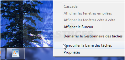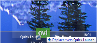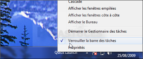 - Si vous souhaitez déplacer la barre de lancement rapide, pour la mettre plus à gauche par exemple ou bien l'afficher en entier, cliquez dessus avec le bouton droit de la souris et désactivez l'option Verrouiller la barre des tâches.