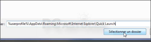 - Dans le champ Dossier, saisissez le chemin suivant : %userprofile%\AppData\Roaming\Microsoft\Internet Explorer\Quick Launch et cliquez sur le bouton Sélectionner un dossier.